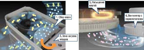 Поступающий в наружный блок атмосферный воздух проходит через кассету из пористого гигроскопичного материала (цеолита). Вращение кассеты приводит к переносу влаги в зону нагрева. Через нагретый участок продувается свежий воздух, захватывая значительно больше влаги, чем он содержал первоначально, когда имел более низ- кую температуру и наоборот, воздух, отдавший влагу и возвращаемый обратно в атмосферу, становится суше.