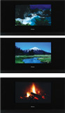 8 вариантов изображения: 3 варианта огня, ручей, море, аквариум, горы, водопад.