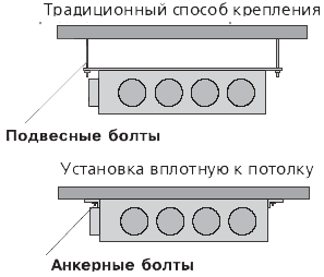 Блок можно крепить вплотную к потолку или подвешивать на специальных болтах.