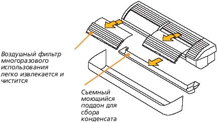 Воздушный фильтр многоразового использования легко извлекается и чистится. Конденсат скапливается в специальном съёмном моющемся поддоне.