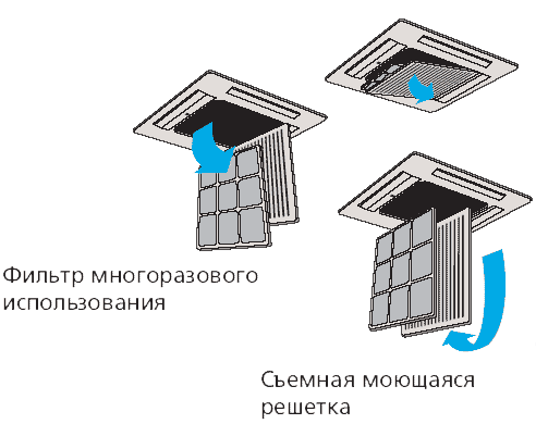 Периодически блок прекращает работать по стандартному алгоритму и переводится системой управления в режим автоматической очистки филтрующих элементов, что предельно упрощает процедуру обслуживания кондиционеров, особенно при установке блока под потолком.