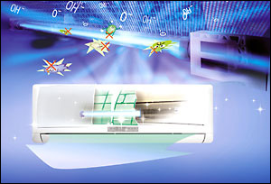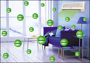 Ионизатор, находящийся внутри корпуса настенного кондиционера, создает высокое напряжение между электродами. При этом водяной пар из воздуха расщепляется на большое количество отрицательных (О2-) и положительных (Н+) ионов. Количество анионов достигает 1000000 (1 млн) в 1 куб.см. воздуха.