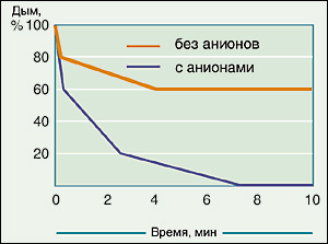 Поскольку ионизатор очищает воздух по всему объему помещения, а не только проходящий через кондиционер, его эффективность очень высока. Дым практически полностью удаляется за 6-7 минут, а болезнетворные микробы - за 2-3 часа (см. графики).