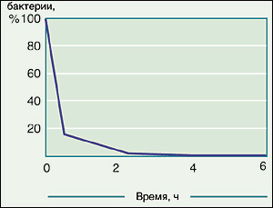 На графике: по горизонтали - время (в часах) работы кондиционера, по вертикали - количество бактерий (в % по отношению к первоначальному количеству).