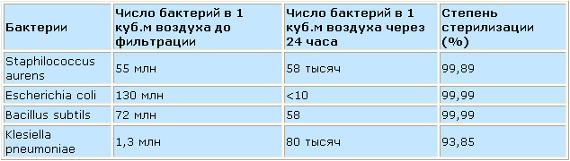 В таблице указано снижение числа наиболее распространенных болезнетворных бактерий при использовании кондиционера с БИО-фильтром в течение 24 часов.