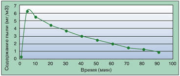 - по вертикальной оси - плотность пыли в воздухе в мг/куб.м при использовании фильтра.