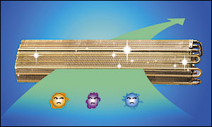 Антибактериальное покрытие значительно снижает количество бактерий: за сутки работы кондиционера их число снижается в 4 раза (для сравнения: при отсутствии такого покрытия бактерии размножатся за то же время в 4 раза).