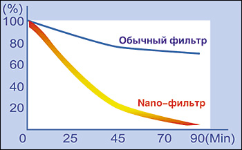 - по вертикальной оси - процент удаления из воздуха неприятных запахов, химических примесей и вирусов при использовании обычного фильтра и NANO-фильтра.