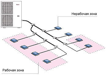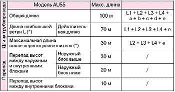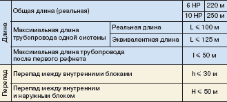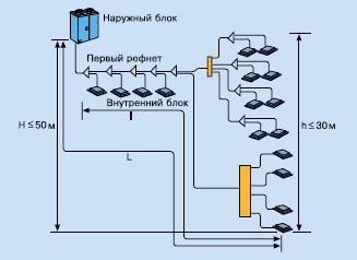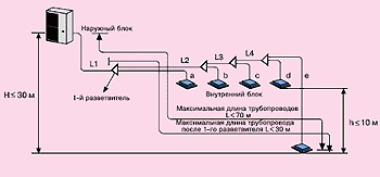 При использовании стандартных Y-образных разветвителей максимальная длина магистрали системы может достигать 50 м, перепады высот между наружным и внутренними блоками – 30 м и между внутренними блоками системы – 10 м. Это позволяет существенно расширить область применения и упростить установку, так как наружные блоки различных систем можно установить в одном месте.