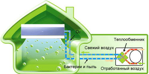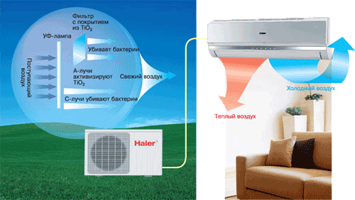 При недостаточной вентиляции в закрытых помещениях, возникающей при установке герметичных стеклопакетов или в силу иных причин, возрастает концентрация углекислого газа и других вредных веществ, повышается влажность, снижается содержание кислорода в воздухе, появляются неприятные запахи. Все это негативно влияет на самочувствие людей, вызывает головную боль, сонливость, потерю работоспособности. Кондиционер Haier с подмесом свежего воздуха позволяет снизить относительное содержание СО2 в помещении, что несомненно благотворно скажется на Вашем состоянии.