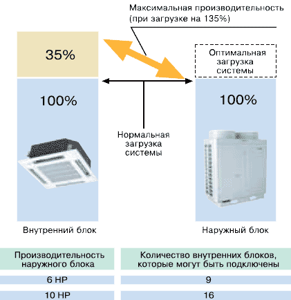 Поскольку система позволяет осуществлять индивидуальное кондиционирование в каждом помещении, процесс охлаждения и обогрева происходит только в тех помещениях, где это необходимо. Соответственно, значительно уменьшаются эксплуатационные расходы. Кроме того, использование инверторных технологий позволяет подбирать оптимальную загрузку наружного блока.