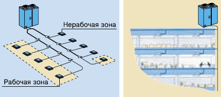 Напорные характеристики блоков позволяют подсоединять к системе несколько воздуховодов в зависимости от желаемой температуры в помещении.