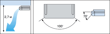 В отличие от объемного распределения, в этом режиме происходит более интенсивное воздухораспределение (угол подачи 180o, длина струи 15 м).