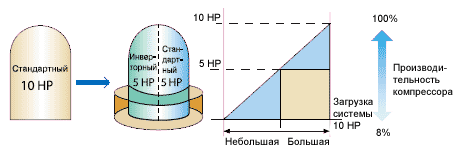 Обычно неинверторный компрессор поддерживает температуру в помещении путем включения и выключения системы, что влечет за собой значительные потери по производительности. Использование нового компрессора значительно сократило энергопотребление, полностью решив проблему уравнивания масла в системе.