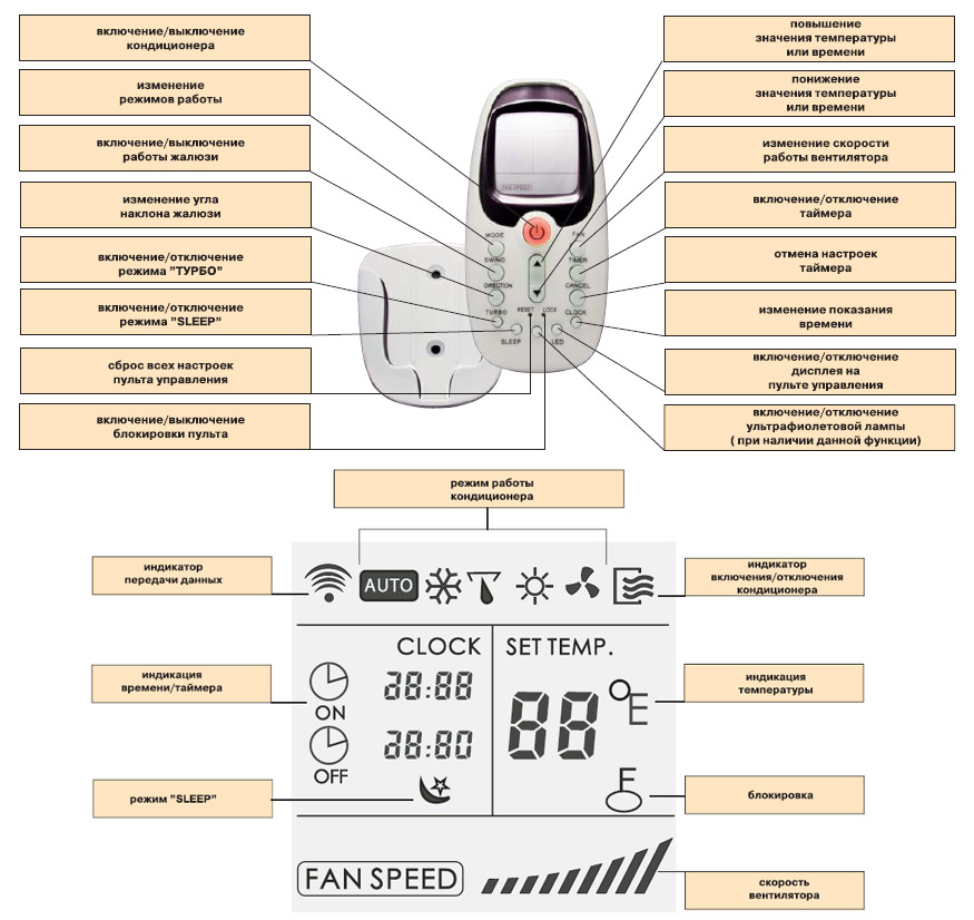 Отображает заданную температуру охлаждения или обогрева, режимы работы и коды неисправностей в случае их возникновения.