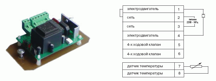 Сделан на монтажной плате. Имеет светодиодные индикаторы для отображения информации и переключатели для управления режимами работы. Реализована функция работы с моделями, оборудованными тепловым насосом, без использования дополнительного реле. Оборудован схемой защиты, запускающей электродвигатель вентилятора на полных оборотах при выходе устройства из строя, что позволяет избежать перегрева и поломки компрессора.