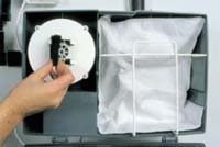 Обслуживание пылесоса не составляет труда. Полный пылевой мешок следует заменить на новый. Пылевые мешки выполнены из четырехслойного микроволокна, которое улавливает даже самые мелкие частицы пыли. Емкость такого пылевого мешка на 50% больше, чем обыкновенного бумажного мешка. Двигатель оборудован фильтром грубой очистки, который время от времени следует удалять и промывать. Просто и удобно!