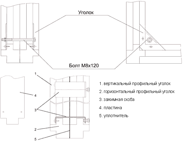 Соединение секций выполняется вверху секций с помощью уголков и болтов, а внизу секций – с помощью зажимных скоб. Стыки секций на дне установки закрываются с помощью специальных пластин.