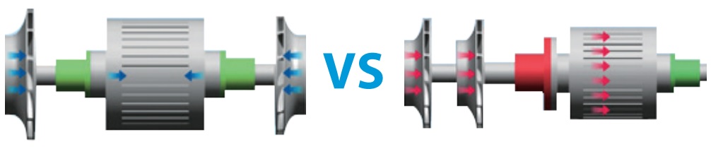 Расположение рабочих колес центробежного компрессора: концевое (слева) и одностороннее (справа)