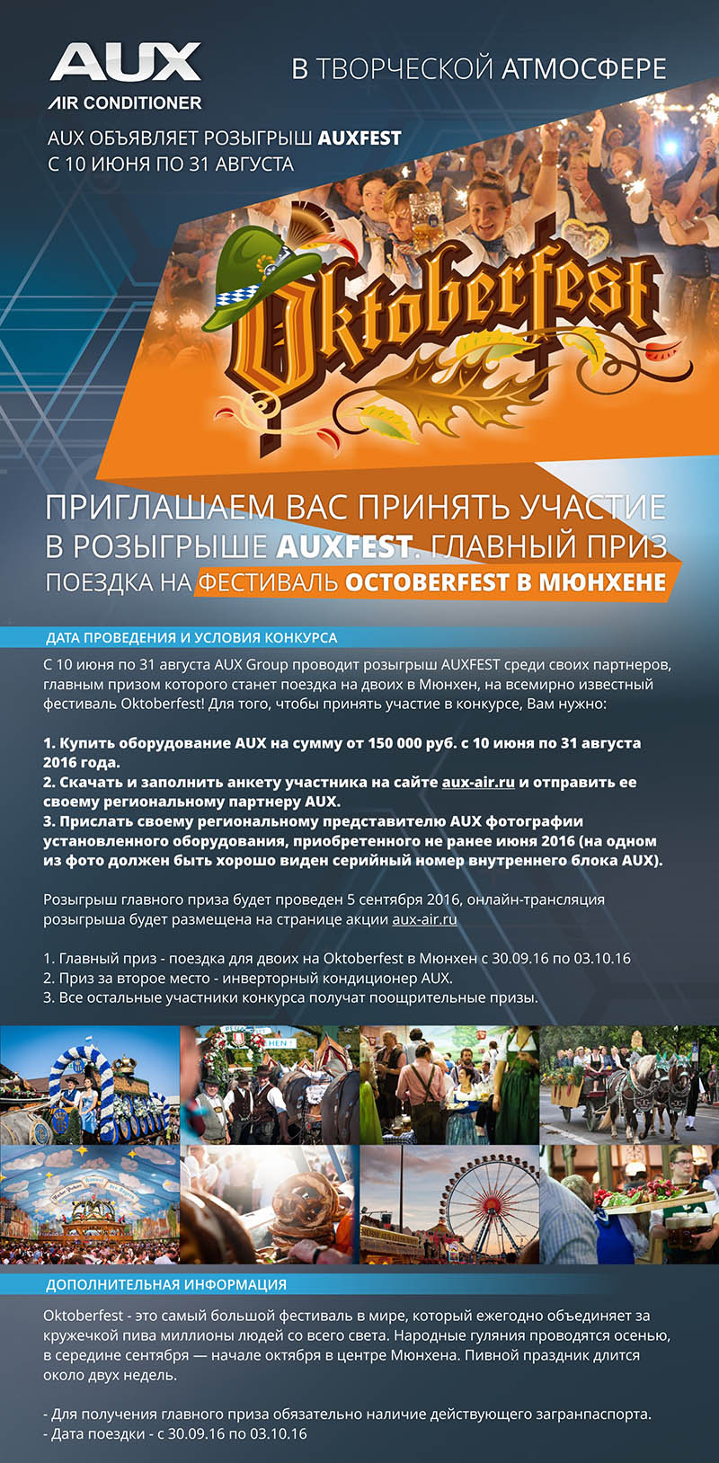 Прямая трансляция розыгрыша путевки на OctoberfestСостоится в прямом эфире 5 сентября в 15.00. на www.aux-air.ru/octoberfest.