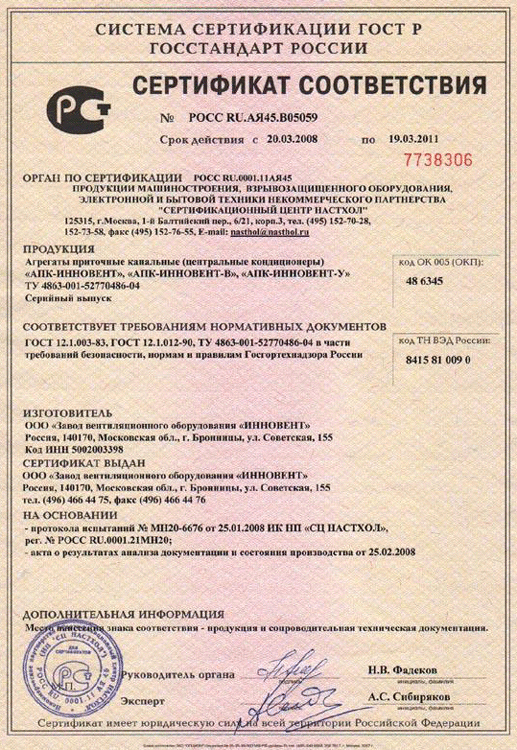 Сертификат соответствия № РОСС RU.АЯ45.В05059 на воздухоприточные установки АПК-ИННОВЕНТ, АПК-ИННОВЕНТ-В, АПК-ИННОВЕНТ-У
