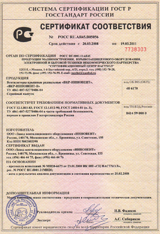 Сертификат соответствия № РОСС RU.АЯ45.В05056 на вентиляторы крышные радиальные ВКР-ИННОВЕНТ, ВКР-ИННОВЕНТ-В