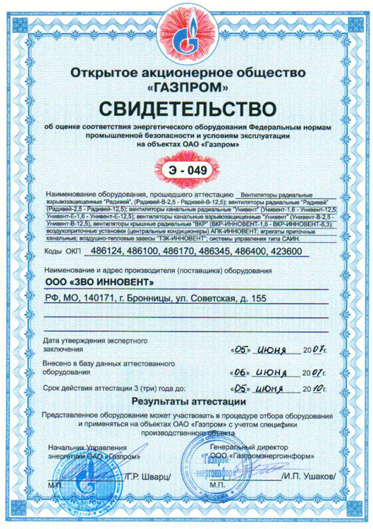 СВИДЕТЕЛЬСТВО об оценке энергетического оборудования Федеральным нормам промышленной безопасности и условиям эксплуатации на объектах ОАО "Газпром"