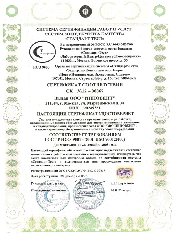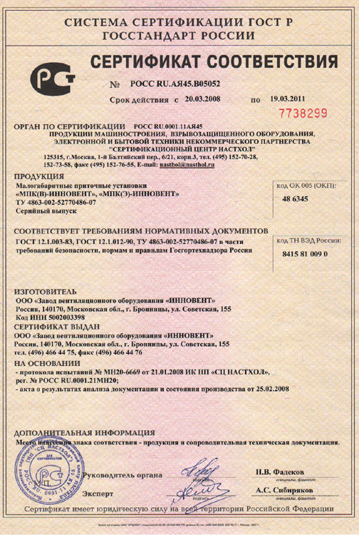 Сертификат соответствия № РОСС RU.АЯ45.В05052 на малогабаритные приточные установки МПК-ИННОВЕНТ