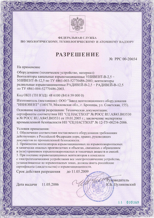 Разрешение на применение № РРС 00-20654 на вентиляторы канальные взрывозащищенные УНИВЕНТ-В