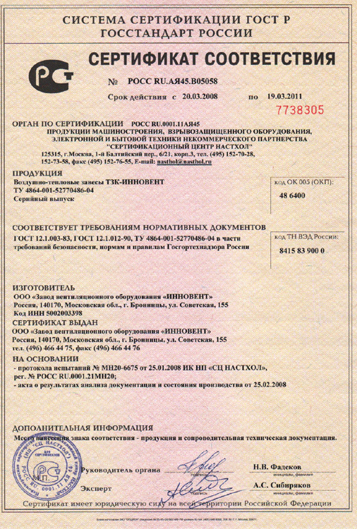 Сертификат соответствия № РОСС RU.АЯ45.В05058 на воздушно-тепловые завесы ТЗК-ИННОВЕНТ