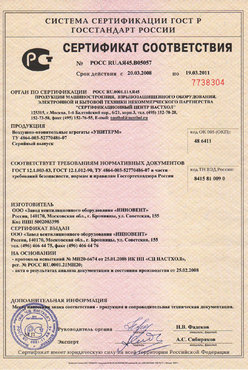 Сертификат соответствия № РОСС RU.АЯ45.B05057 на воздушно-отопительные агрегаты УНИТЕРМ