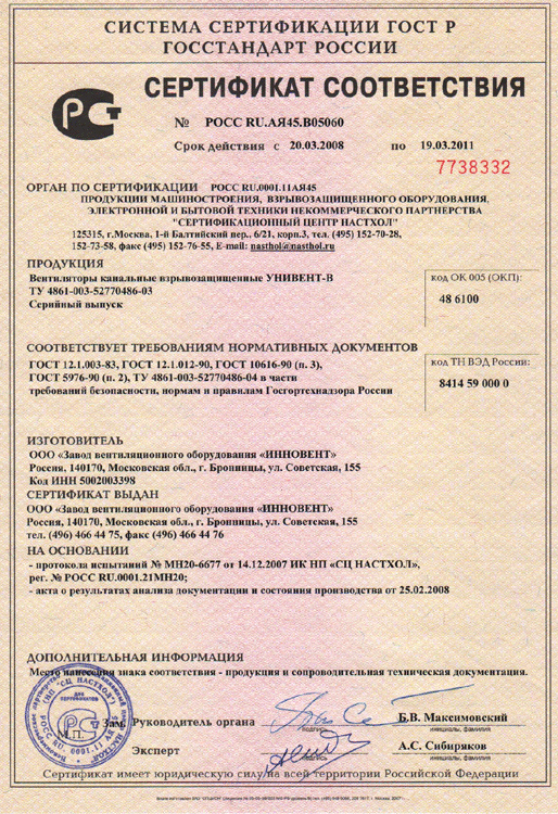 Сертификат соответствия № РОСС RU.АЯ45.В05060 на вентиляторы канальные взрывозащищенные УНИВЕНТ-В