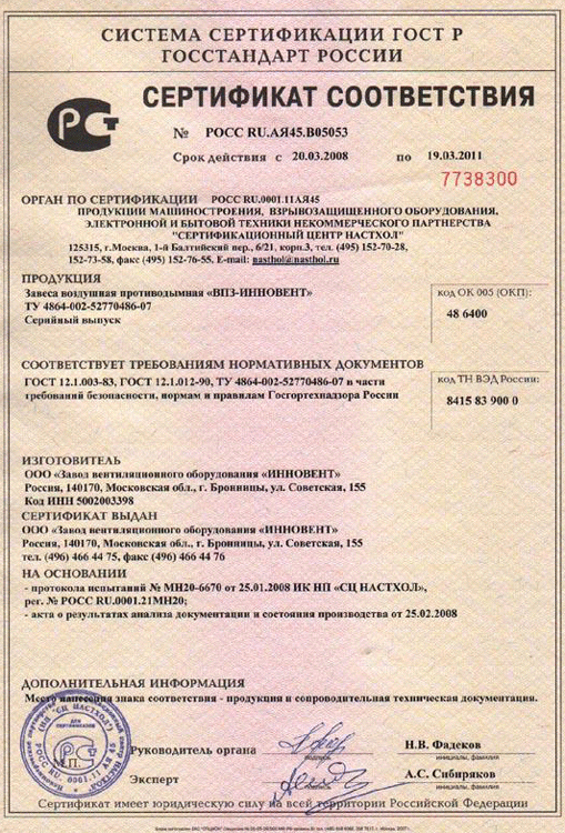 Сертификат соотвествия № РОСС RU.АЯ45.В05053 - Завеса воздушная противодымная ВПЗ-ИННОВЕНТ