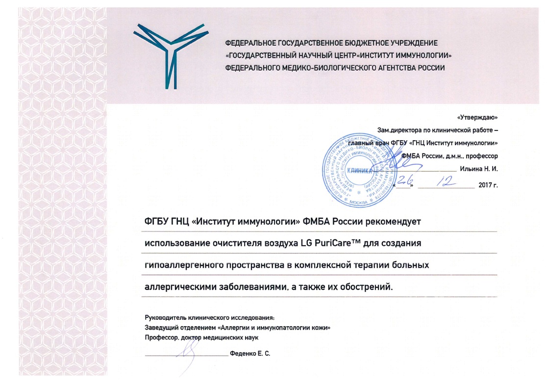 Компания LG Electronics приняла участие в ходе Всероссийской конференции «Клиническая иммунология и аллергология — практическому здравоохранению» в МосквеЭффективность работы очистителя воздуха LG PuriCare подтверждена специалистами аллергологами и иммунологами и рекомендована к использованию в семьях с маленькими детьми.