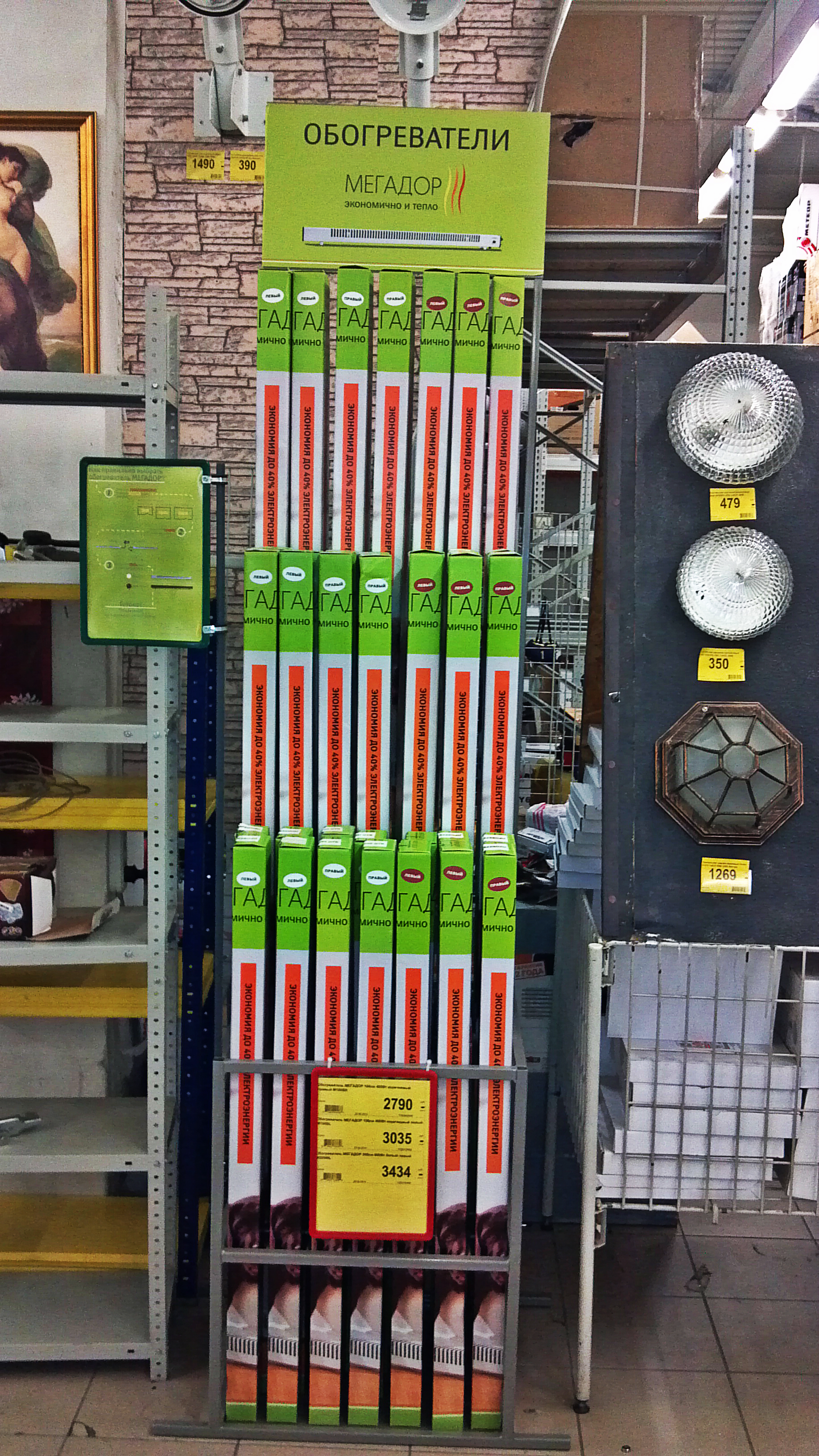 Энергосберегающие обогреватели «МЕГАДОР» отапливают «ПЯТЕРОЧКУ»В магазине Пятерочка г. Старая Русса в 2012 году демонтировали отопление, которое было проведено от котельной соседнего здания. В результате магазин площадью 421 кв.м. оказался без тепла и две зимы 2012-2014 обогревался 3 тепловыми пушками, общей потребляемой мощностью 30 кВт/ч.