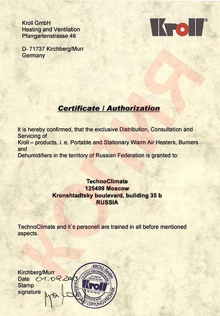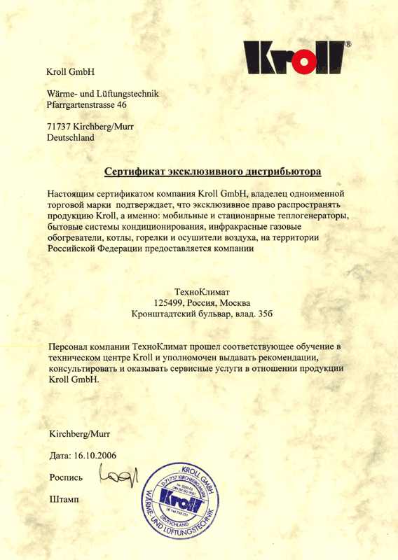 Сертификат эксклюзивного дистрибьютера Kroll (англ. яз.)