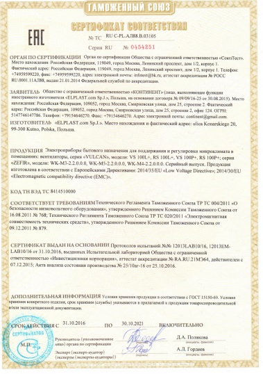 Сертификат соответствия на электрические бытовые приборы Elplast