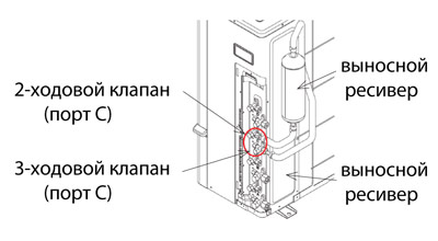 Выносной ресивер должен устанавливаться между 2- и 3-ходовым запорными клапанами (порт С) на наружном блоке.