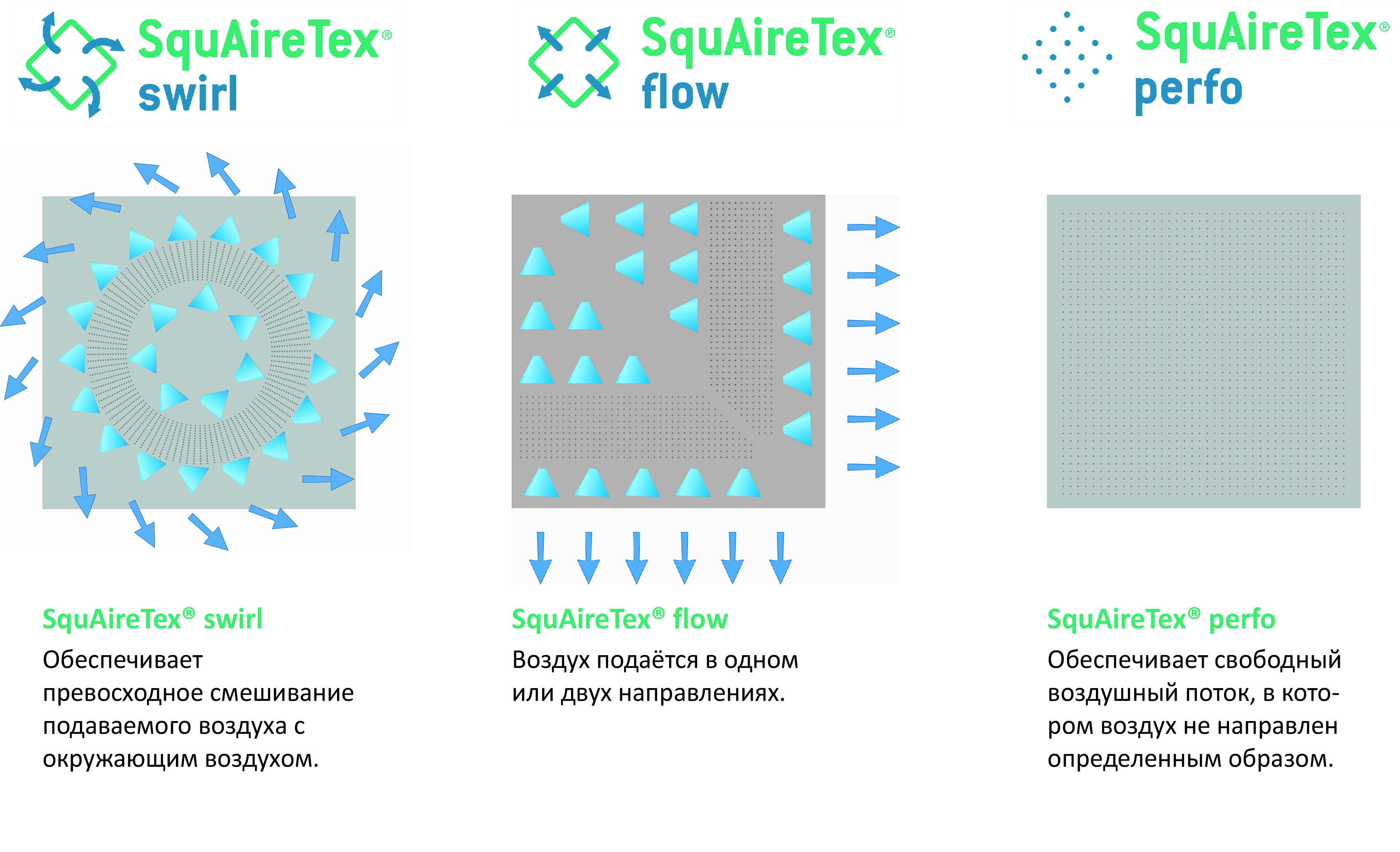 Плоские текстильные диффузоры SquAireTex® предназначены для использования в качестве распределителей воздуха при установке в подвесные потолки. В зависимости от конструкции они могут распределять воздух как спиралевидным потоком, так и в одном или нескольких направлениях. За исключением алюминиевой рамы диффузоры полностью изготавливаются из ткани, включая находящийся над потолком пленум. Воздух проходит через отверстия в ткани, которые могут представлять собой либо выполненную лазером перфорацию, либо текстильные карманы, соединенные с тканью посредством сварки. Присоединительный пленум может быть изготовлен с изоляционным слоем для предотвращения конденсата и снижения уровня шума. Плоские диффузоры доступны в любом цвете или комбинации цветов, а также могут иметь графический рисунок.