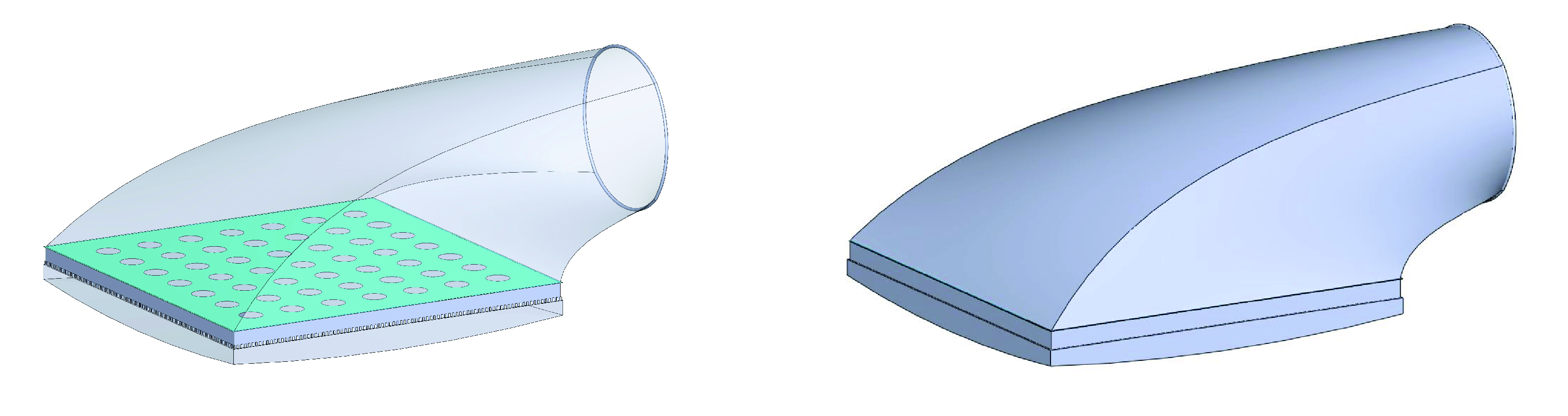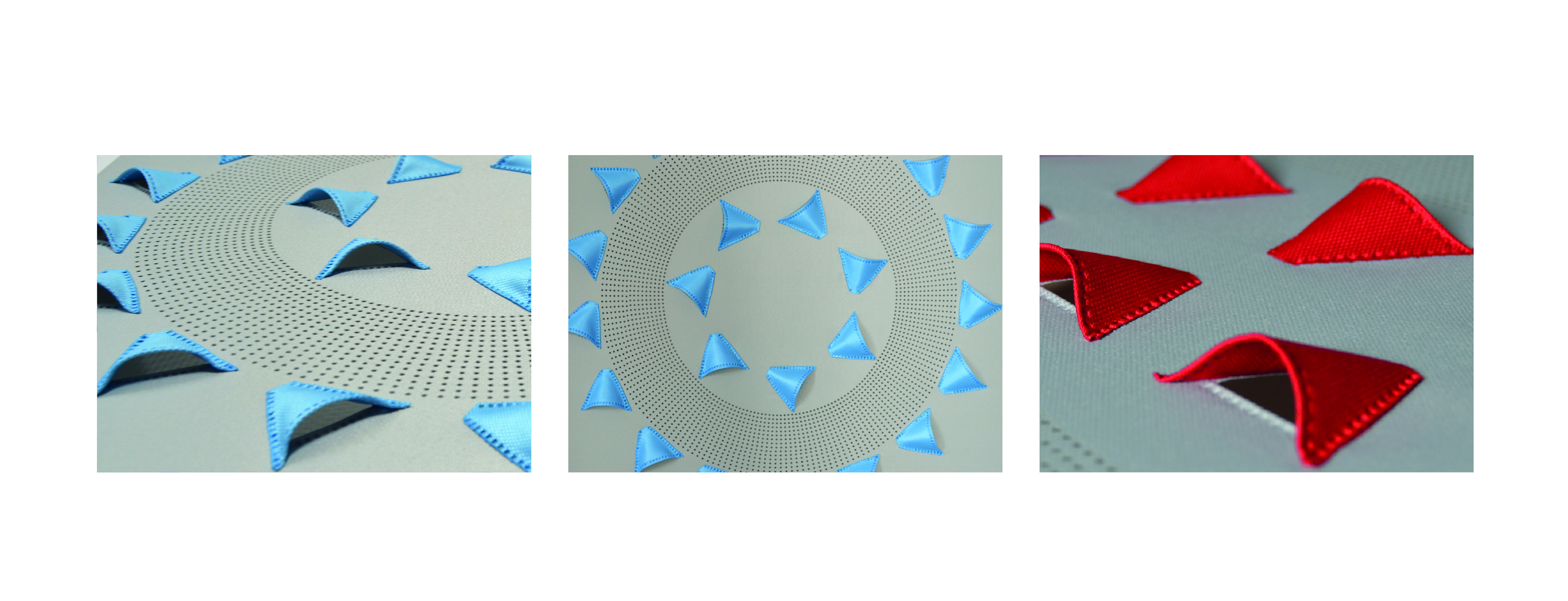 Необходимый расход воздуха обеспечивается специально спроектированными текстильными карманами, которые закрепляются над отверстиями в ткани. Данная конструкция гарантирует минимизацию аэродинамических шумов. Часть приточного воздуха проходит сквозь перфорацию (диаметром 2-3,5 мм), а затем смешивается с воздушным потоком, создаваемым текстильным карманами.