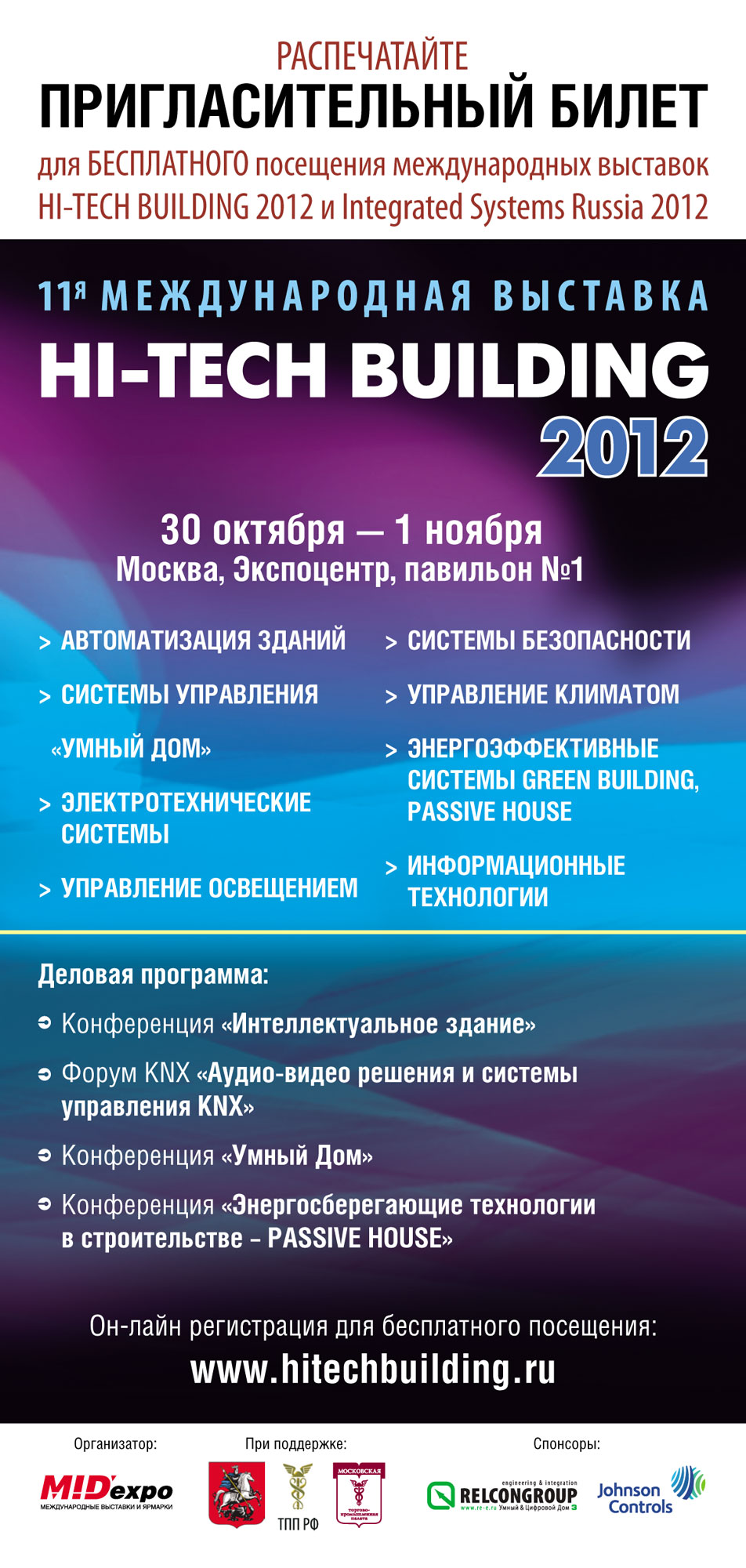 Рынок автоматизации зданий – актуальные вопросы и трендыС 30 октября по 1 ноября состоится главное событие на рынке автоматизации коммерческой и жилой недвижимости — международная выставка-форум HI-TECH BUILDING 2012.