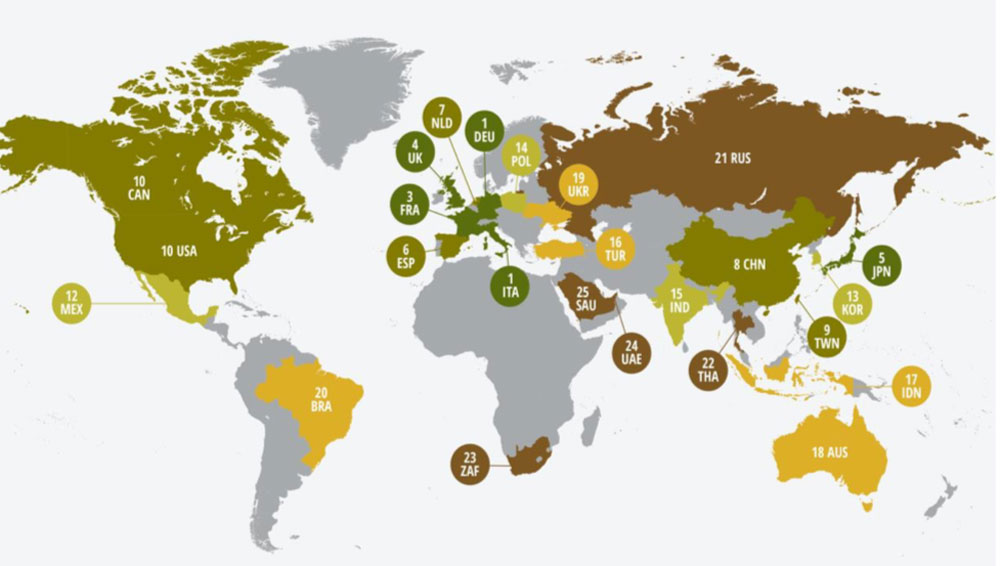 А что же Россия? Пока она занимает 21-е место, уступая соседним Китаю (8-е место), Индии (15-е место), Турции (16-е место) и Украине (19-е место). Последнее, 25-е место в рейтинге, досталось Саудовской Аравии.