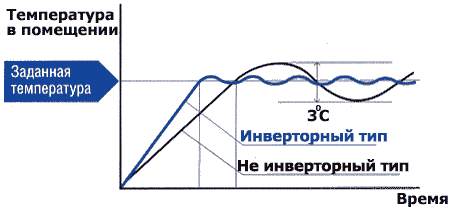 Компрессор обычного кондиционера работает с постоянной мощностью. При достижении заданной температуры он отключается, через некоторое время включается снова. При таком режиме работы неизбежны резкие температурные колебания.