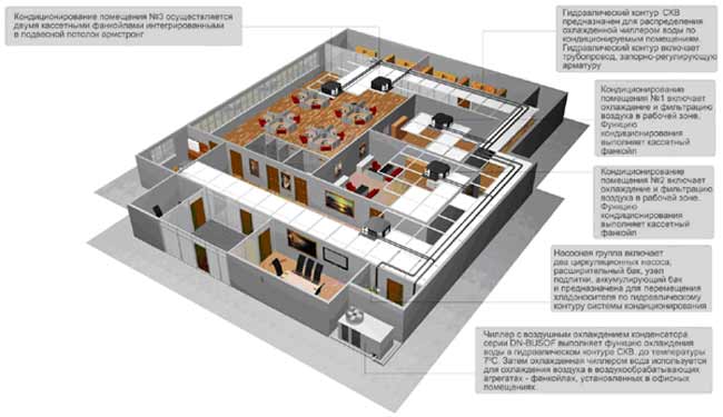 Установка в каждом помещении независимого кондиционера с водяным охлаждением конденсатора расширяет возможности СКВ по поддержанию индивидуальных комфортных условий. |