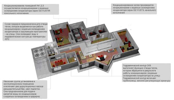 Система кондиционирования в этом случае включает в себя кондиционеры с водяным охлаждением конденсатора канального и консольного исполнения. Они выполняют функцию охлаждения, нагрева и фильтрации воздуха. Гидравлический контур охлаждения конденсатора осуществляет отвод тепла, образуемого в результате работы кондиционеров, и состоит из трубопровода, запорно-регулирующей арматуры и циркуляционных насосов. Сухая градирня установлена снаружи здания и обеспечивает охлаждение воды в гидравлическом контуре охлаждения конденсатора.