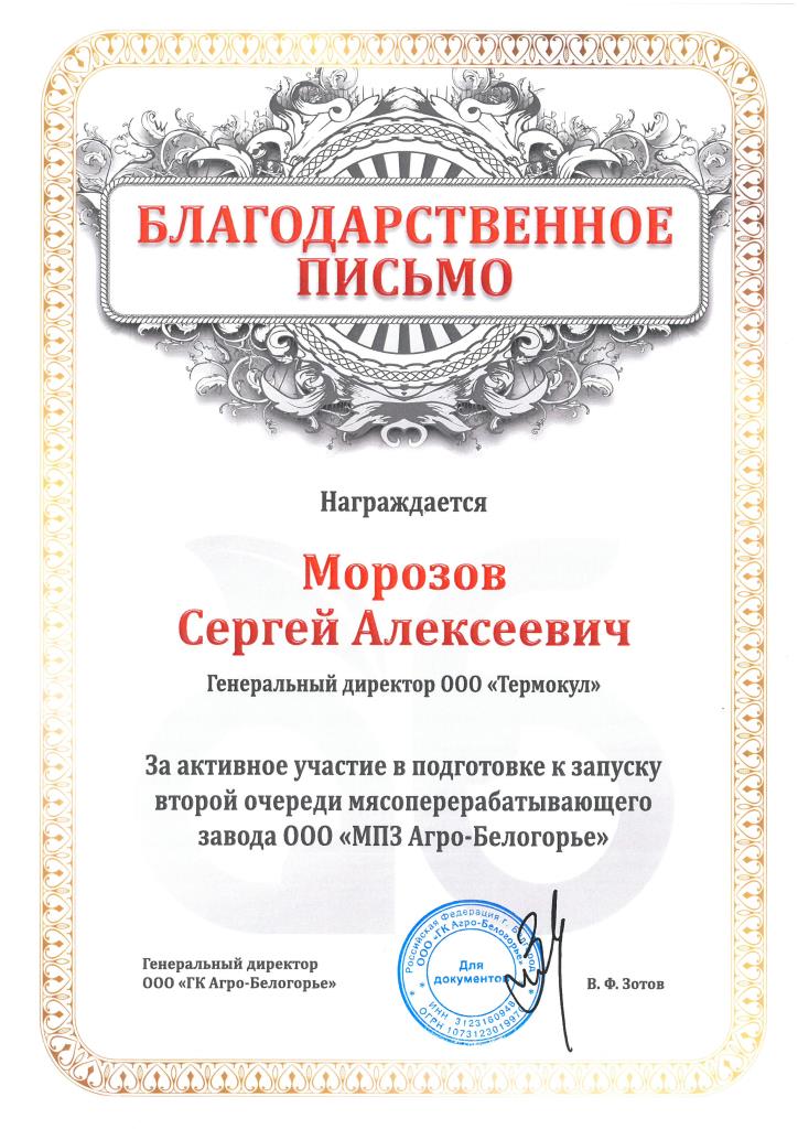 Генеральный директор компании посетил открытие второй очереди МПЗ «Агро-Белогорье»Группа компаний «Агро-Белогорье» запустила вторую очередь мясоперерабатывающего завода в Яковлевском районе Белгородской области. Открытие производственного комплекса посетил генеральный директор ООО «Термокул» Морозов Сергей Алексеевич.