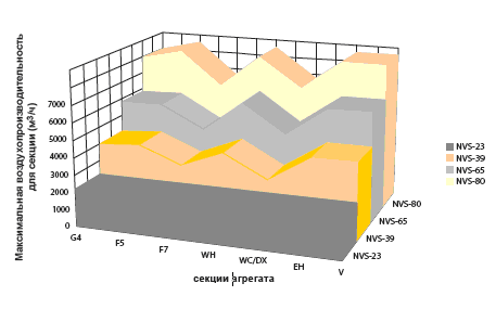 VENTUS N-TYPE с воздухопроизводительностями от 700м3/ч до 8500 м3/ч. Новый типоряд представлен четырьмя вентагрегатами, которые обозначаются NVS 23, NVS 39, NVS 65, NVS 80. Диапазон расходов воздуха для отдельных функциональных элементов канальных вентагрегатов N-TYPE представлен на рис.1