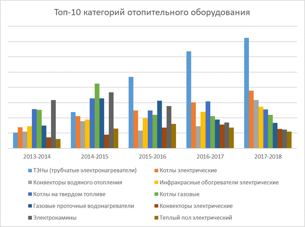 Если взглянуть на диаграмму Топ-10 категорий отопительного оборудования, то можно заметить, что разные категории оборудования в разные зимы проявили себя по-разному. Если в первые две зимы наибольшим спросом у посетителей пользовались котлы отопления, то, начиная с зимы 2015-2016 вперед уверенно вырвались ТЭНы. Причем, со все более заметным опережением год от года. Этой зимой их доля в общей структуре спроса на решения по отоплению составила почти 15%.
