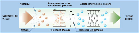 В плазменном фильтре образуется зона ионизированного воздуха, который под действием электрического поля высокого напряжения находится в плазменном состоянии. После прохождения воздухом электростатического поля более 95% частиц пыли, молекул запахообразующих веществ и частиц пыльцы растений будут осаждаться на поверхности фильтра.