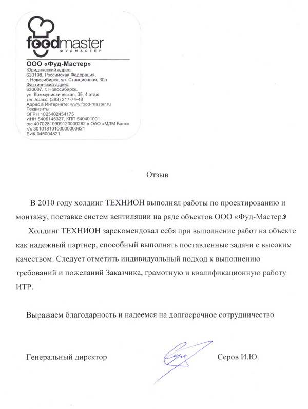 В 2010 году холдинг ТЕХНИОН выполнял работы по проектированию и монтажу, поставке систем вентиляции на ряде объектов ООО «Фуд-Мастер». Холдинг ТЕХНИОН зарекомендовал себя при выполнение работ на объекте как надежный партнер, способный выполнять поставленные задачи с высоким качеством. Следует отметить индивидуальный подход к выполнению требований и пожеланий Заказчика, грамотную и квалификационную работу ИТР. Выражаем благодарность и надеемся на долгосрочное сотрудничество.